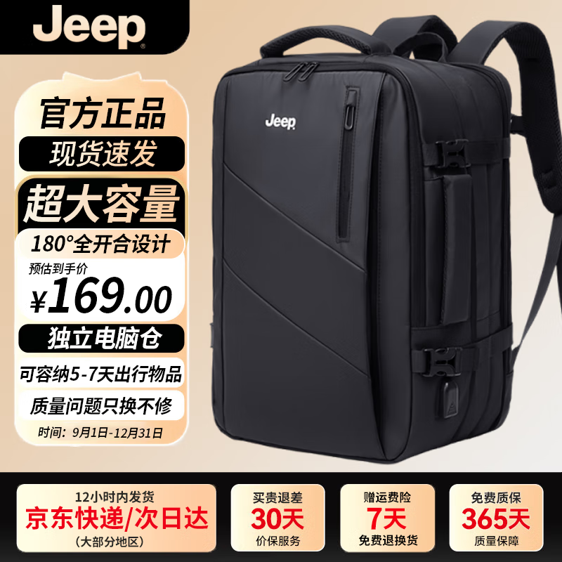 JEEP双肩包男大容量背包可扩容旅行包出差手提包商务通勤电脑包书包 黑色