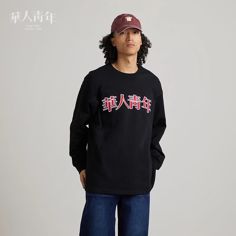 華人青年经典贴布绣基础长袖T恤打底衫潮牌纯棉春秋男女情侣上衣男女同款 黑色 【贴布刺绣】 2XL 建议【160-190斤】
