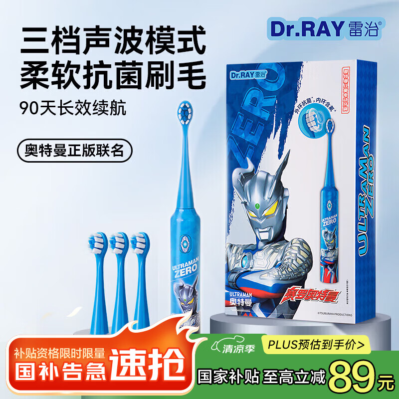 雷治(Dr.RAY)儿童电动牙刷3档防蛀模式 奥特曼赛罗款适用3-6-12岁电动牙刷头 送2支刷头【到手4支刷头】