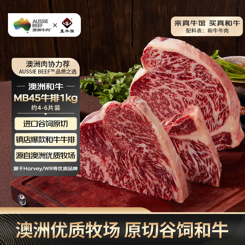 【105.9包邮】真牛馆x京东plus 澳洲和牛MB45原切牛肉牛排 1kg