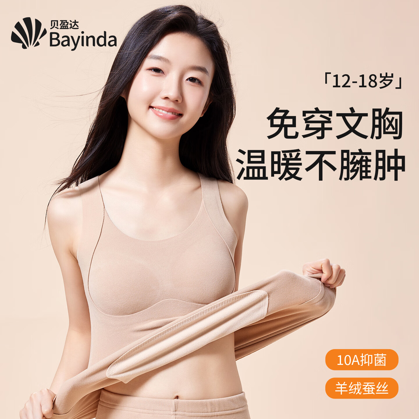 贝盈达青少年保暖内衣秋衣女款加绒加厚女大童少女上衣背心带胸垫一体式 粉色 3XL 125-145斤